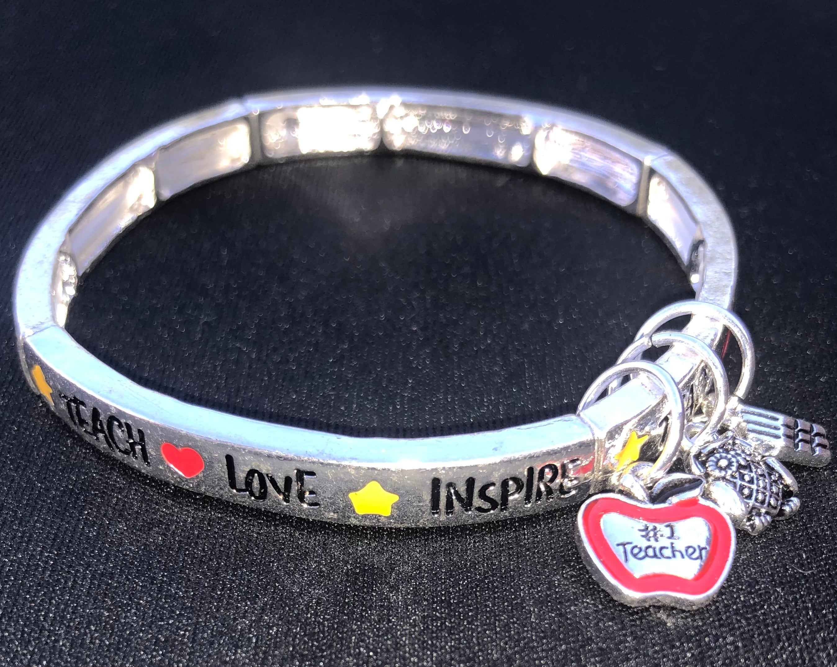 Teach, Love, Inspire stretch Bracelet with books, Apple and owl charms.