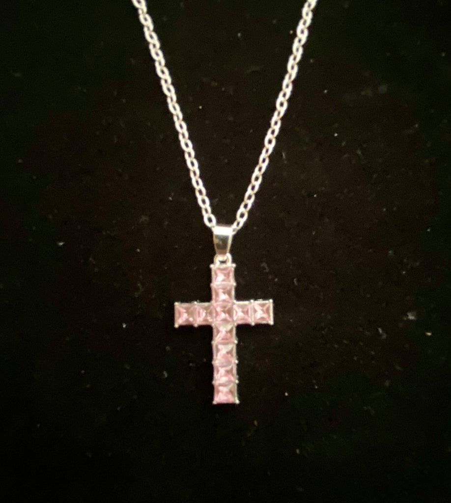 Light Pink Stone Cross Necklace with Silver 18" chain